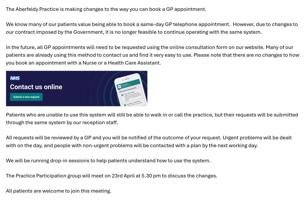 The Aberfeldy Practice has created three informative self-care videos on common illnesses. We encourage you to watch these videos if you are experiencing any related symptoms before reaching out to the practice. If you still wish to consult with a GP, please feel free to contact the practice directly or submit an online consultation form.